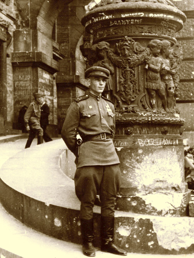 Мой отец у Рейхстага, май 1945 года. Через три месяца ему исполнится 24, а покамест здесь, на снимке, он на десять лет моложе моего сына…